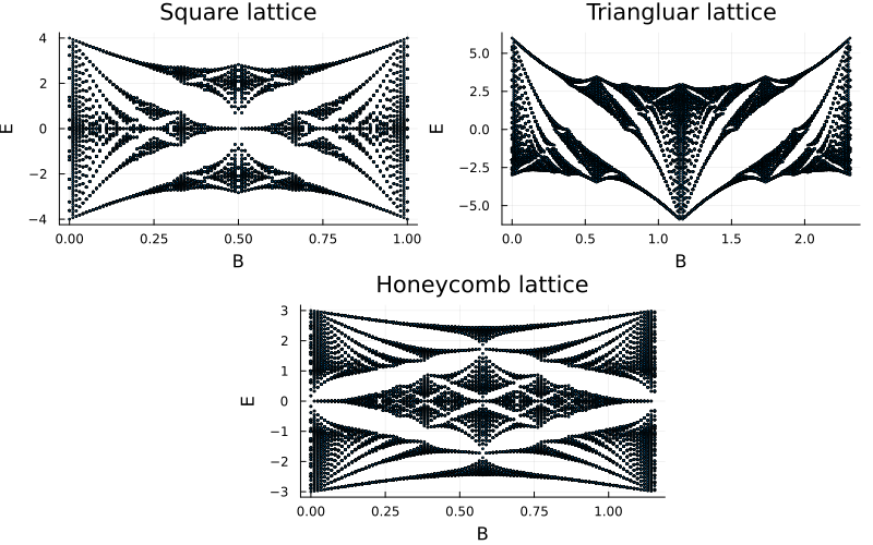 Let us plot the Hofstadter butterfiles for square, triangular and honeycomb lattices. The magnetic field field will be changed from zero to one $\phi_0$ flux quantum per plaquette.