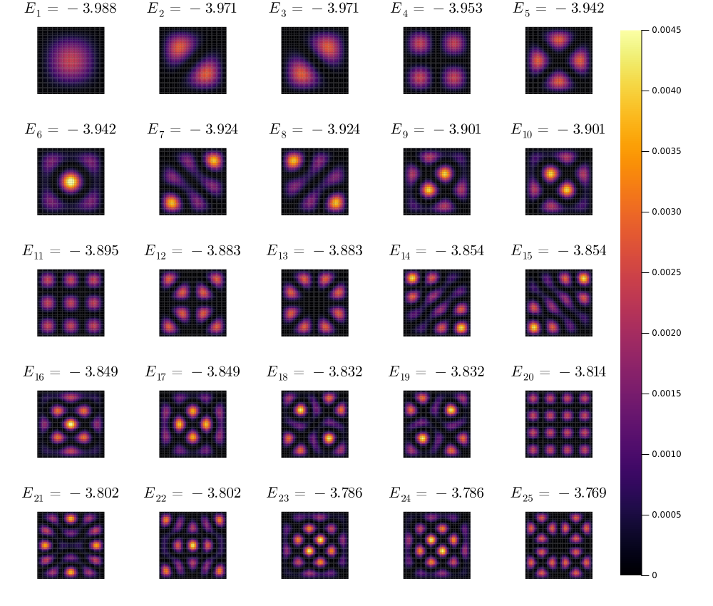 Here we take a square lattice and build a Hamiltonian for it. Then we find its eigenstates and plot their local density on heatmaps.